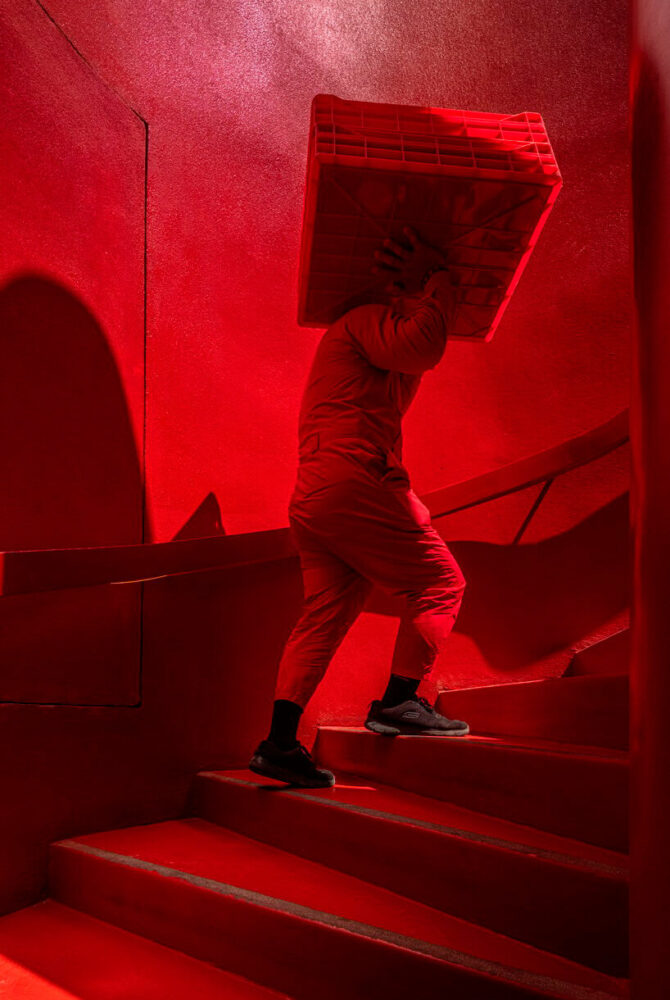 the design incorporates a red spiral staircase, serving as the main vertical element
