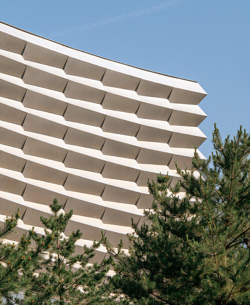 the project sits like a ring placed over the terrain, with its funnel-like roof forming a shaded perimeter walkway and an introverted core.