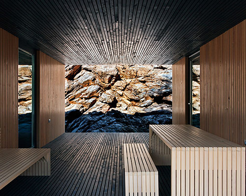 in the outskirts of kőszeg, hungary, the ‘hideg house’ by architect attila beres of beres architects poses a contrasting yet symbiotic addition to the base of a decommissioned rock quarry. expressing purity in form and material, the linear home is composed of lines that present themselves at different scales. a continuous dark band of vertically-oriented larch timber planks wraps around a floor plan that is the ‘abstract footprint of a family’s lifestyle,’ in the architect’s own description. at 110 square meters, the home consists of a contrastingly natural yet structurally similar cladding interrupted by moments of transparency or void. the strict rigidity of the exterior forms and textures is offset by the flowing organic lines of carved rock that nests it. each room contains views out towards the stone and over the heavily wooded area in front of the home, lending to a direct connection with nature. an open deck breaks the solidity of the interior and punctures through the entire mass. the entire home, from site preparation to the custom furniture inside, was built entirely by the client and his wife over a period of three years.