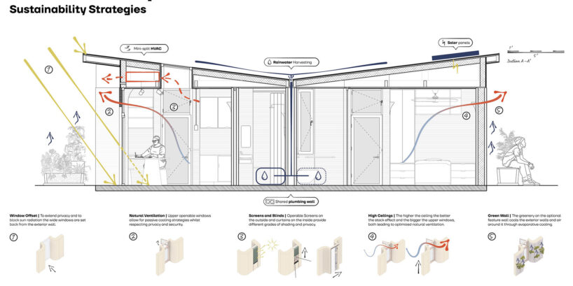 Furthermore, sustainability is embedded in every aspect of the design process. The Community First! Residences employ various climate-responsive strategies, including passive cooling techniques through high ceilings and strategic window placements. Operable screens and setbacks offer privacy while enhancing natural ventilation, and green feature walls cool the exterior through evaporative cooling. These homes also incorporate rainwater collection and centralized plumbing systems, ensuring resource efficiency. By utilizing recyclable materials and emphasizing a co-creation process for easy-to-manufacture furnishings, Beta Realities ensures the longevity and environmental sustainability of each residence.