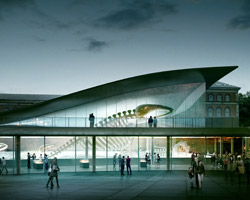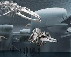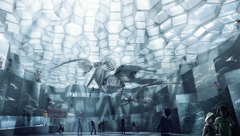clockwise from top left: intersection between two landscapes; geological and botanical garden; underground museum; whale hall and greenhouses