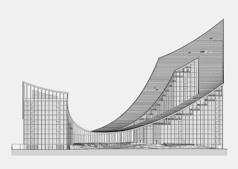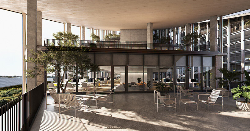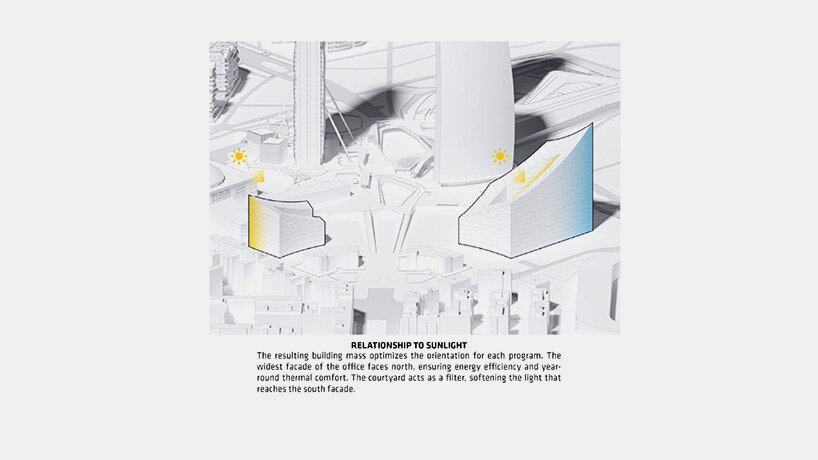 the project sits like a ring placed over the terrain, with its funnel-like roof forming a shaded perimeter walkway and an introverted core.