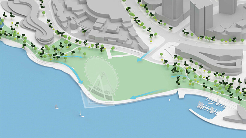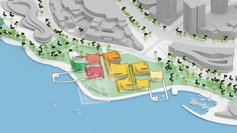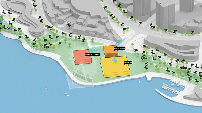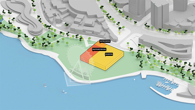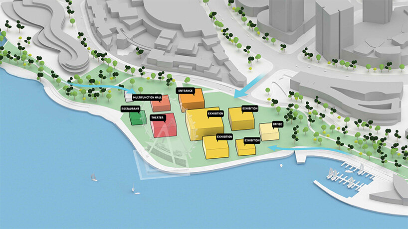 the project sits like a ring placed over the terrain, with its funnel-like roof forming a shaded perimeter walkway and an introverted core.