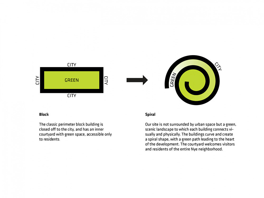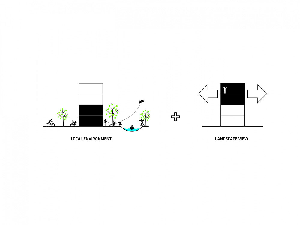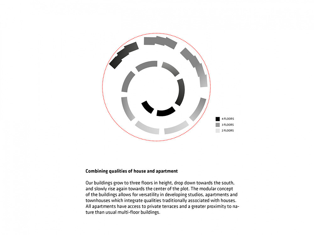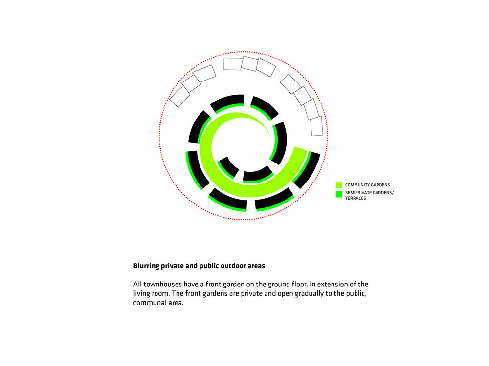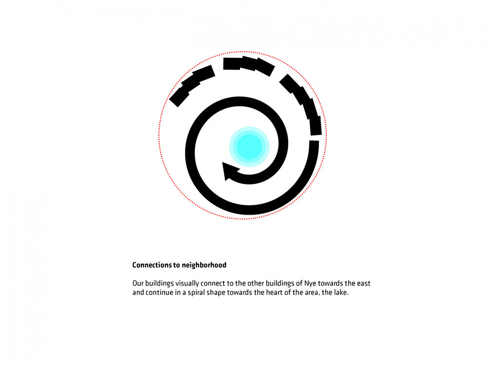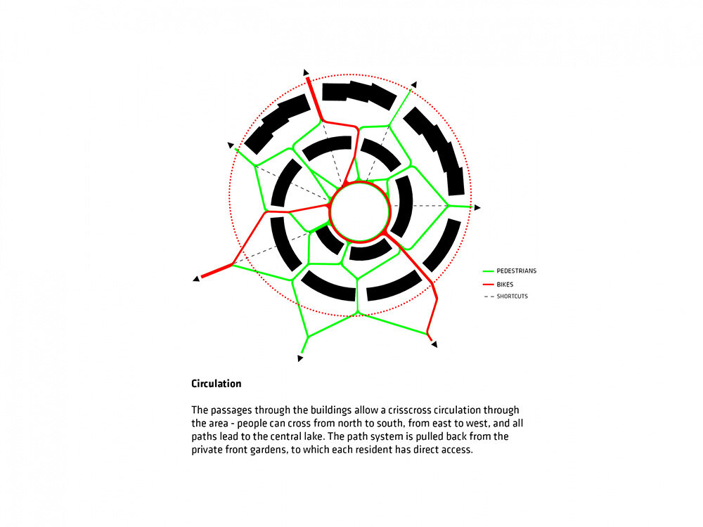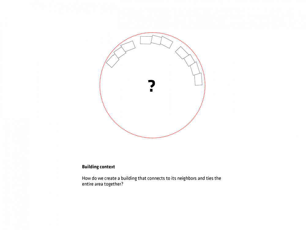 the project sits like a ring placed over the terrain, with its funnel-like roof forming a shaded perimeter walkway and an introverted core.