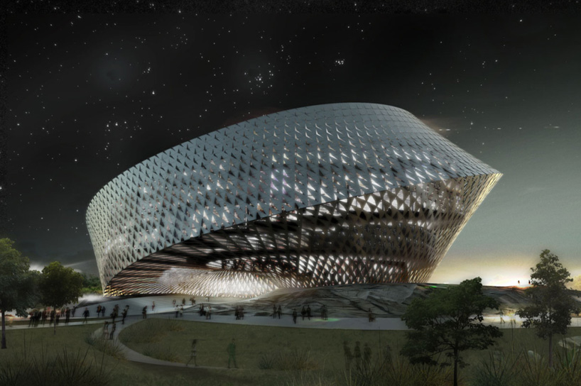the project sits like a ring placed over the terrain, with its funnel-like roof forming a shaded perimeter walkway and an introverted core.
