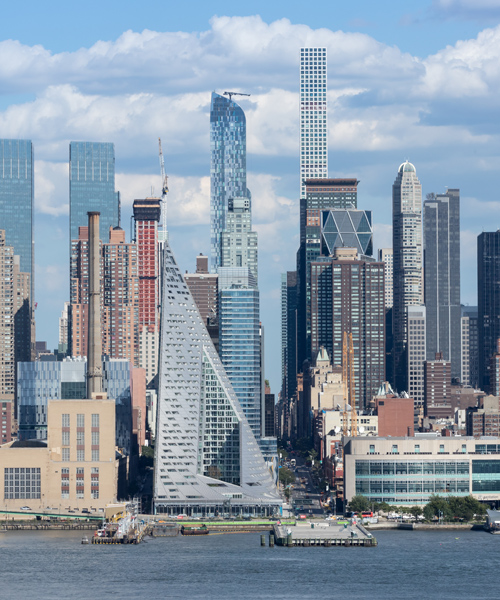 BIG was commissioned by the durst organization to design a building for the site in the spring of 2010, and construction got underway in 2011. occupying nearly a full city block on the hudson river, the 32-story building began welcoming residents earlier this year, with construction completing in fall 2016. the building peaks at a height of 450 feet at its north-east corner, maximizing the number of apartments and maximizing river views. the building’s volume changes depending on the viewer’s vantage point: from the west, it is a warped pyramid, while from the east, its appears as a slender spire.