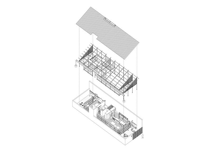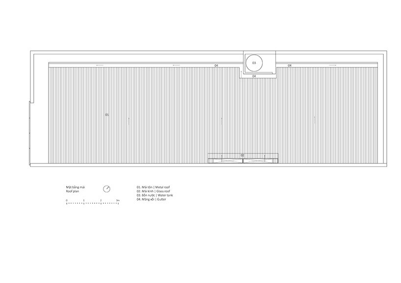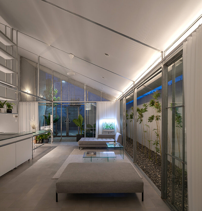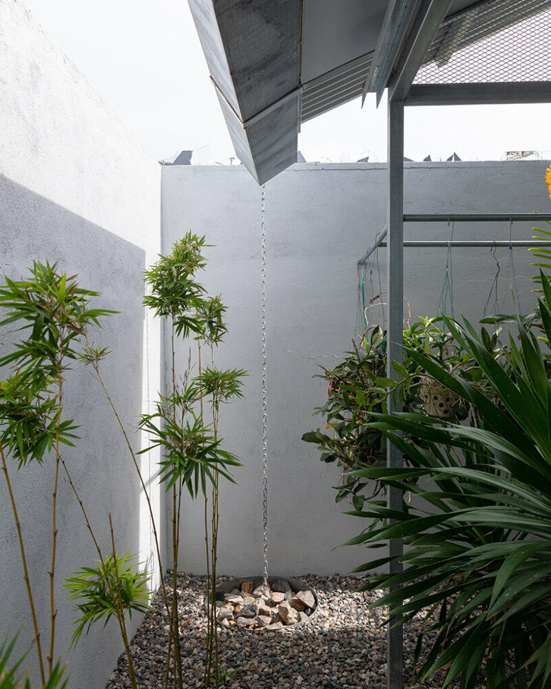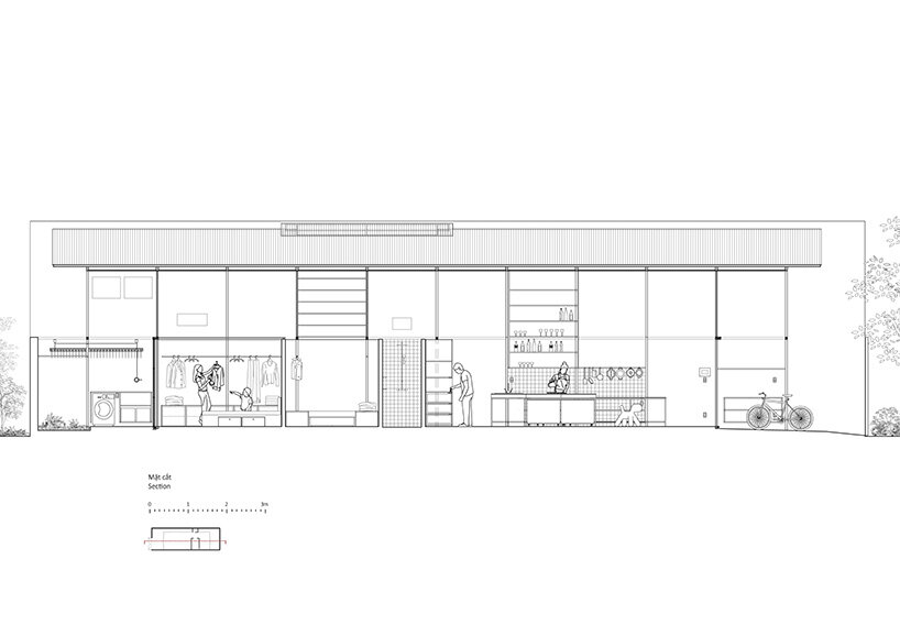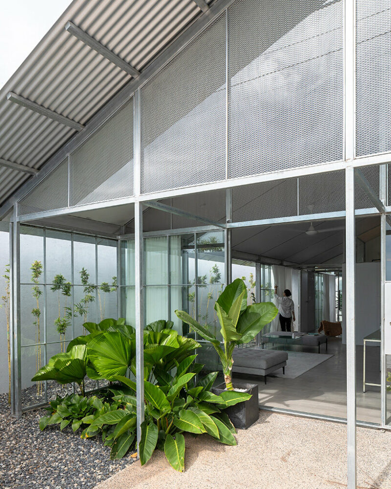 The architects at MIA Design Studio shape the Binh Thuan House as a corrugated iron structure supported by a prefabricated steel frame — a simple structure common across the countryside. The team notes the integrated design of the shed: ‘the bearing frame of the house must also be a sliding door frame, a frame for hanging furniture, a frame for curtains, a frame for hanging clothes.’