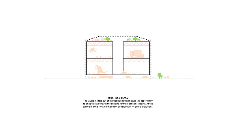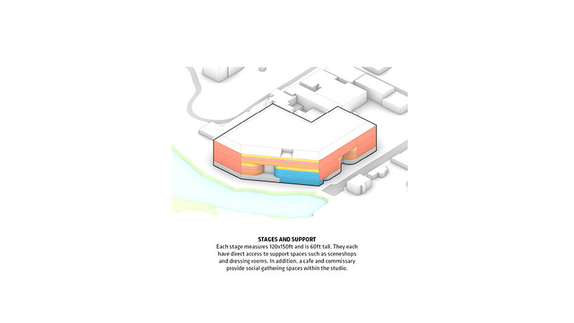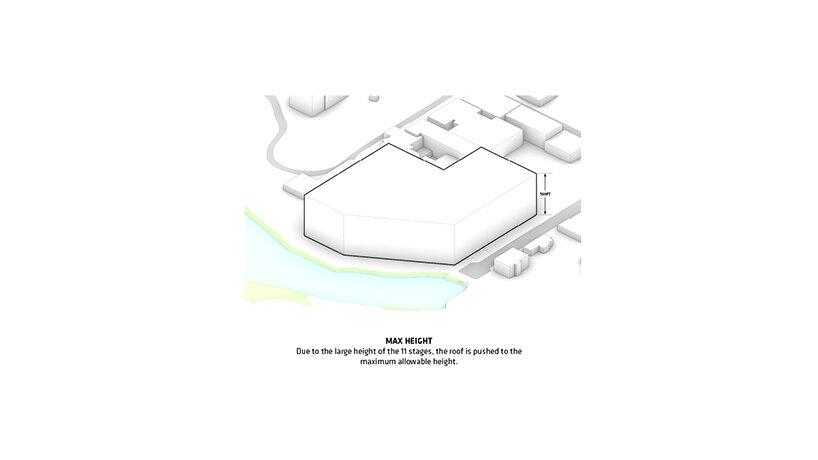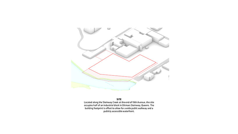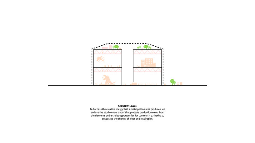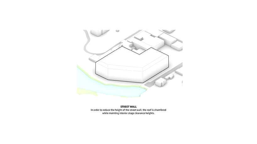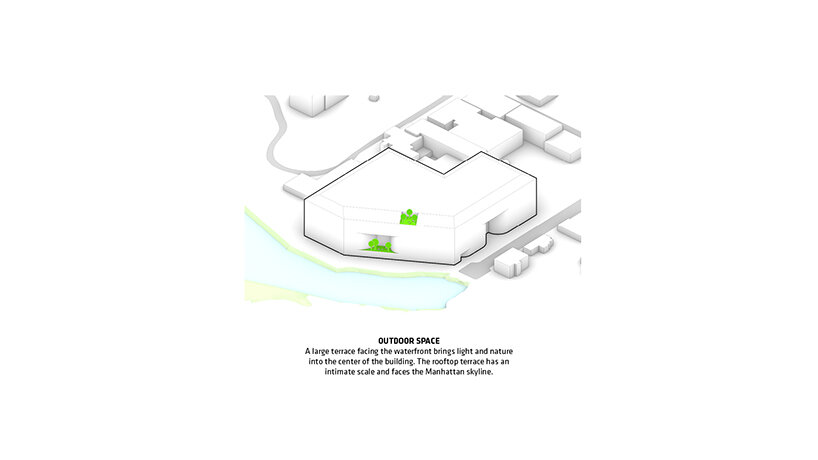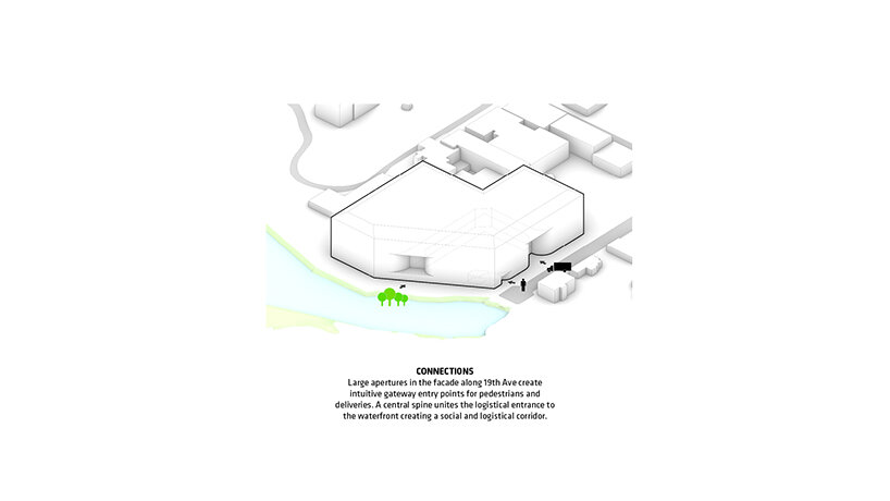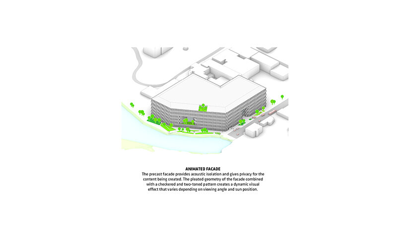 the project sits like a ring placed over the terrain, with its funnel-like roof forming a shaded perimeter walkway and an introverted core.