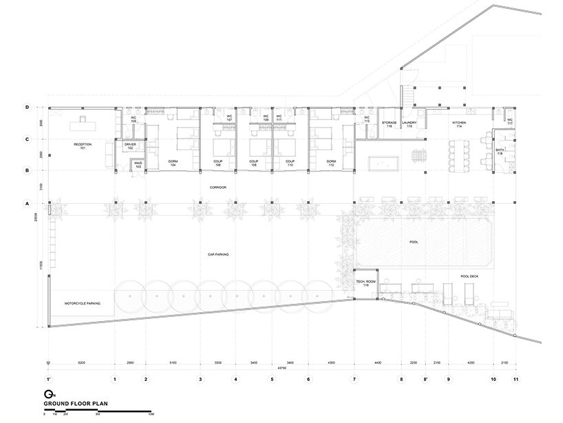 designing the duyen casa II hotel and renovating the existing house, block architects retains most of the bearing structures and partition walls. the lobby and guest suites open widely east to look out toward a palm-lined front yard, while a communal kitchen and shared area face the pool. the compact hotel includes three bedrooms which sleep two each, and two ‘dorms’ which sleep five each. while finished materials and furniture are sourced from local factories and workshops, the renovation integrates materials which had been left over from the original house and reused.