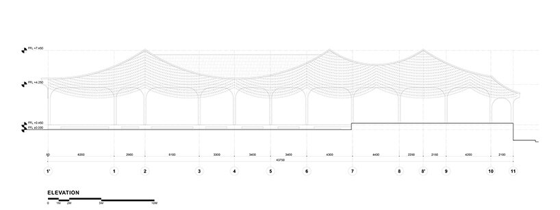 with its duyen casa II hotel project, block architects (see more here) works with the local craftspeople of the vietnamese village. the team comments: ‘we started with visiting handicraft villages, getting to know local building materials so that we could find a solution to the design and the suitable building materials. inspired by knitting techniques in handicrafts, we use tiles, round steel bars, and bricks to knit smooth curtains to cover the two parts of the house.’ these seemingly delicate ‘earthen’ curtains define the facade and act as passive cooling sunshades.
