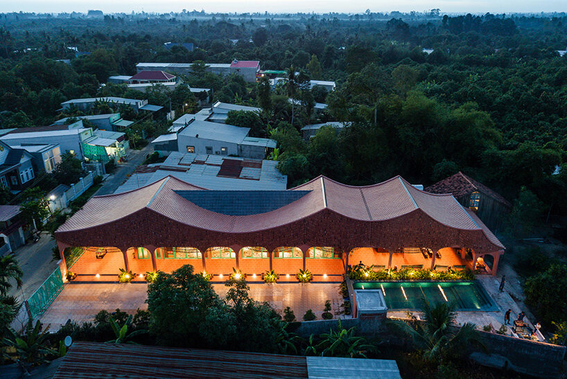 in a suburb of cao lãnh, a southern vietnam city filled with lush vegetation and sprawling fruit gardens, block architects completes its duyen casa II hotel. the project results from the renovation of an existing house which was organized with an L-shaped plan. transforming the structure, the design team introduces a swooping new roof of ornamental brickwork which encloses the long wing. this space houses the five guest suites of the boutique hotel while the short wing is enclosed with a sheet metal roof, expressing the origins of the building.