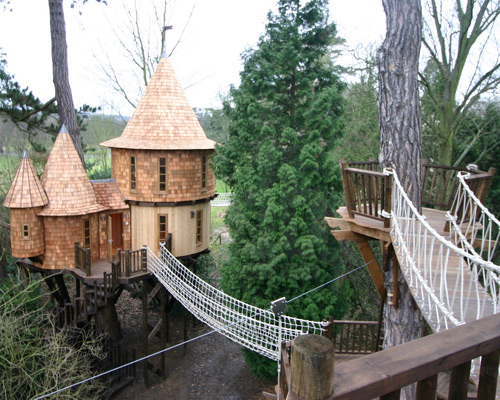the children’s treehouse is characterized by its tall pointed towers, which reference medieval architectural forms. inside, a concealed hatch in the upper floor leads to a game room above. additionally, the complex includes an 80-yard zip line, which accesses the ‘assault course’ on the forest ground.