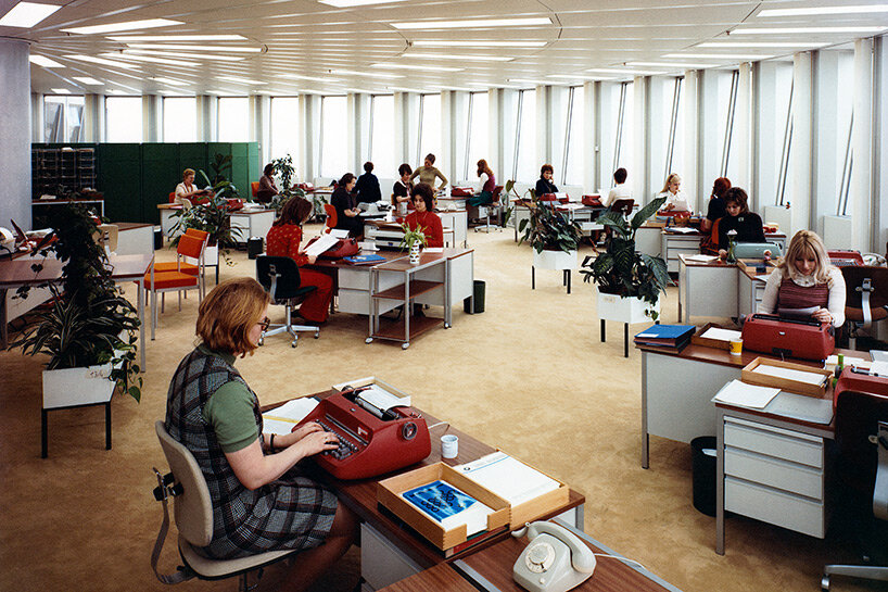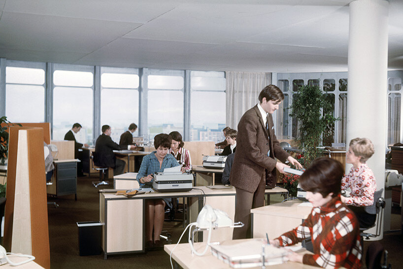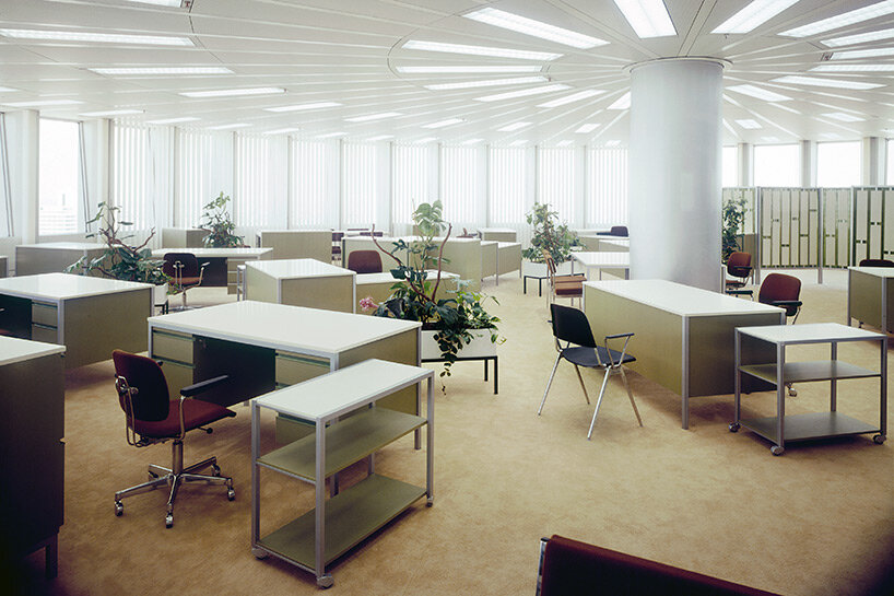 What the directors initially regarded as too futuristic, too far removed from practical applications and too experimental, was ultimately considered the optimal solution: a circular floor plan of four office segments on each level, created by the four individual suspended columns of the Tower, which form the cloverleaf shape of the external floor plan of the administration building. The architect himself based his reasoning for the shape of the building exclusively on the logical rationality and functionality of a circular floor plan for the modern organizational approach to office work. In Karl Schwanzer’s view, the cloverleaf floor plan resulted in the following characteristics for modern office design: short routes to optimize lines of communication and office organization between the individual departments, and maximum flexibility in configuring available space.