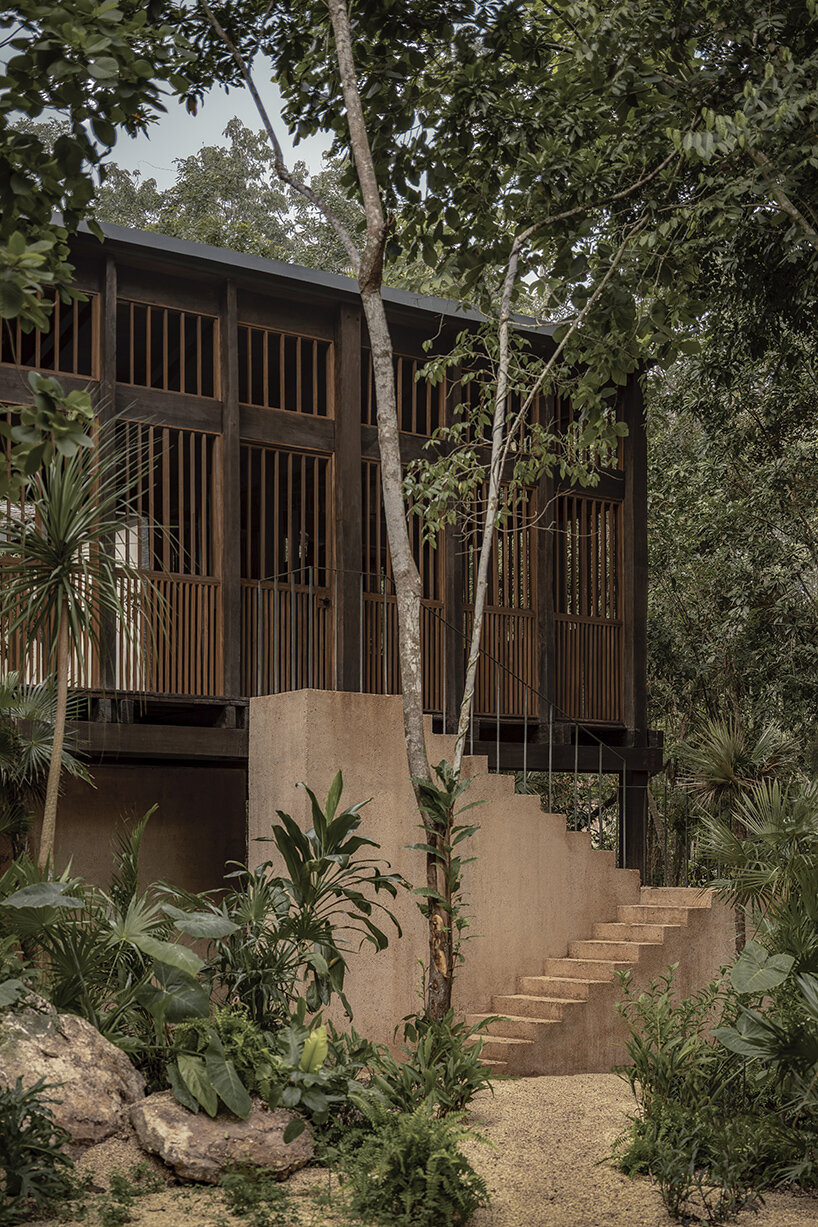 Frida Escobedo’s design approach to the Boca de Agua hotel is a modern reflection of the traditional social centers with stone temples and wooden houses of the Yucatán region. Moreover, with references to local culture, the common areas serve as visual anchors in the landscape. A series of passages connect these spaces with the villas for accommodation, the pool area, and recreational and relaxation areas — namely a rooftop with a lagoon view, a pier, a restaurant, a bar, a kitchen, and terraces. Other facilities on-site include a security booth and offices. Among the hotel’s 26 rooms and suites, the Masterpool Jungle Treehouse is the most notable, featuring its own pool and a spacious terrace for guest enjoyment.