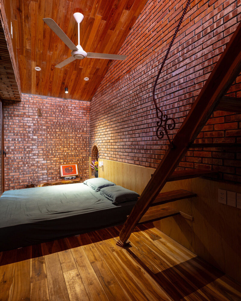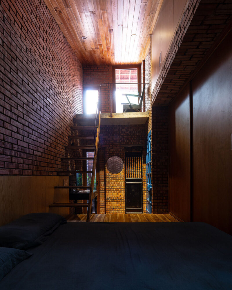 bedrooms are compact and warm with timber ceilings and framed garden views