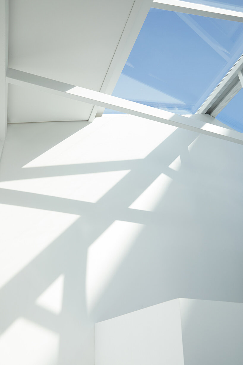 timber pillars among all-white interiors recall the image of a sailboat