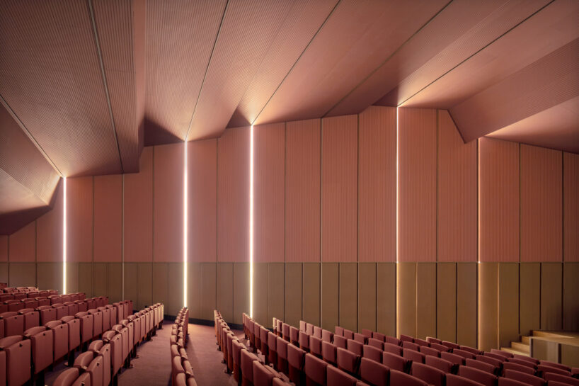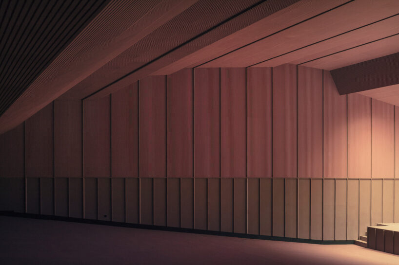 the project sits like a ring placed over the terrain, with its funnel-like roof forming a shaded perimeter walkway and an introverted core.