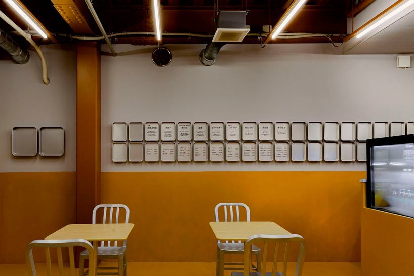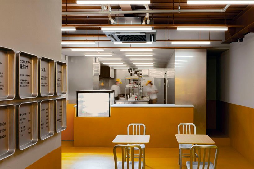 moment (find more here) has chosen yellow as the new store’s main color, in order to remind customers of the golden frying oil. in fact, the exterior is covered with yellow glass, giving the impression that the entire structure is covered in oil. formed as a food laboratory, the bright yellow interior showcases an open configuration. the fryer is placed close to the seating area so that the sound of the frying process can be heard throughout the restaurant, while the aroma and temperature stimulate the appetite.