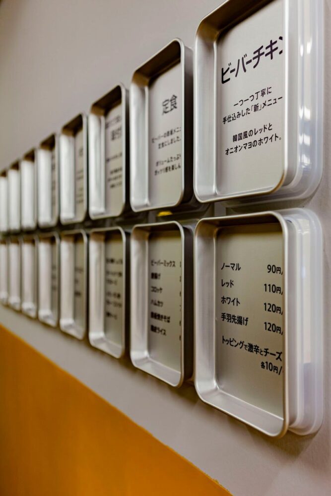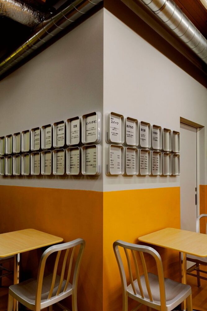 design studio moment has completed the renewal of ‘beaver’, a specialty fried food shop in the suburbs of tokyo, japan. choosing bright yellow as the new signature color of the restaurant, the designers took over the creative direction of the entire project, from the logo, to the menu board graphics, and the staff uniform design. the new design brings out new possibilities and attractions, by focusing on beaver’s main feature, ‘frying everything’.