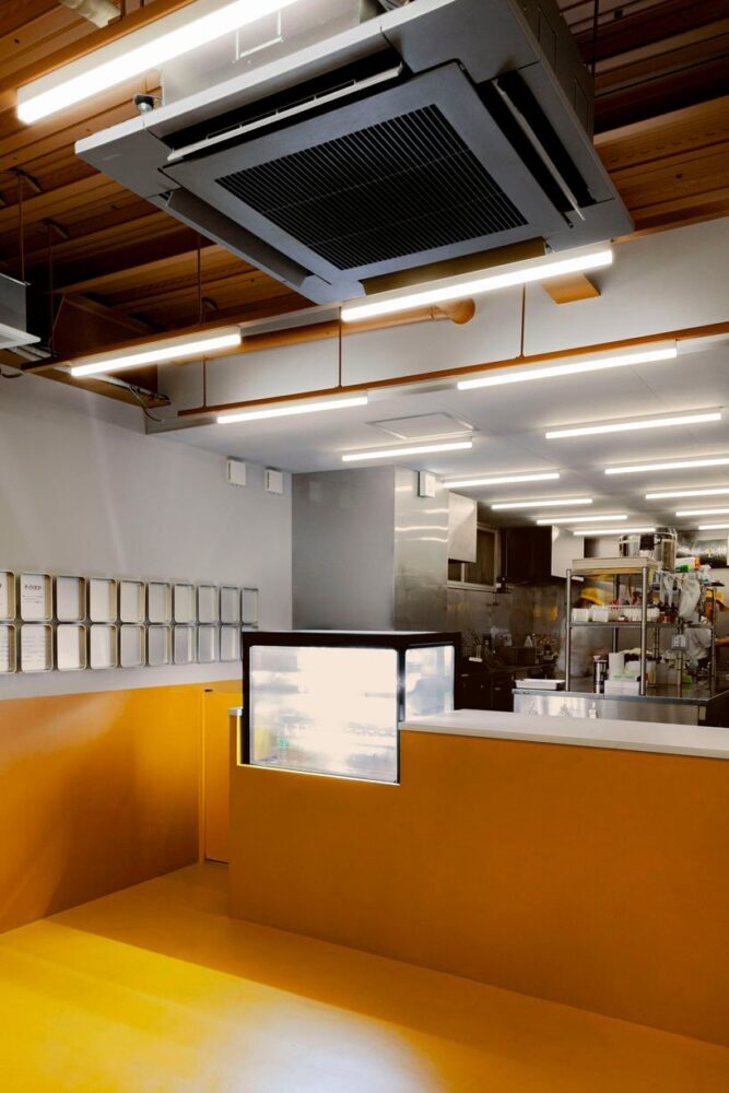 bright yellow tones clad renovated fried food shop by moment in the suburbs of tokyo