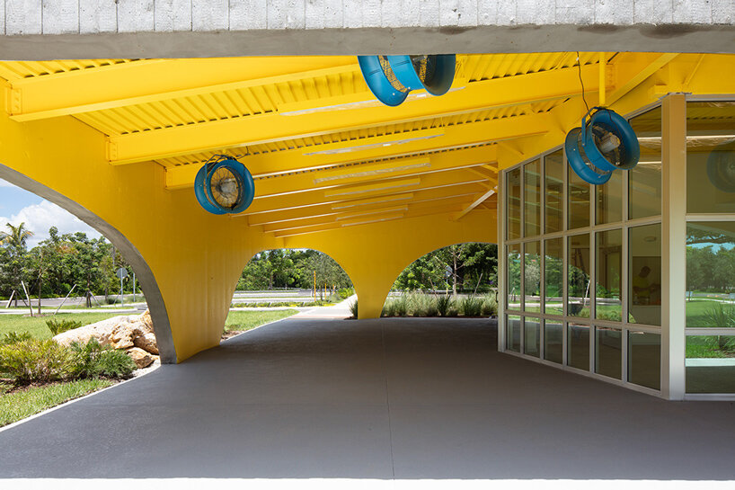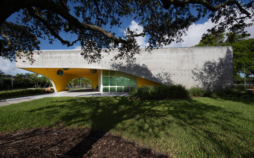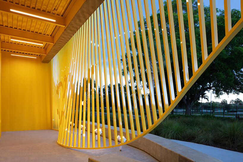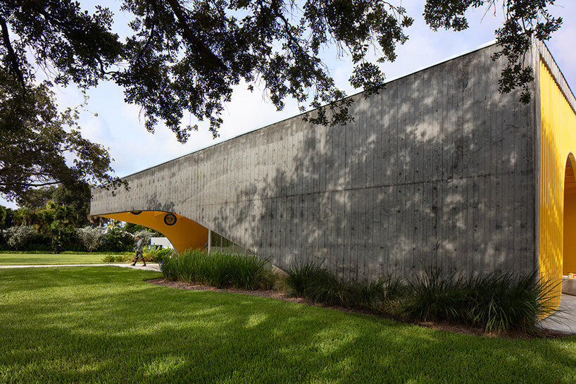 brooks + scarpa sculpts florida pavilion with yellow archways and lattice screenlattice screen outlines a semi-outdoor patio