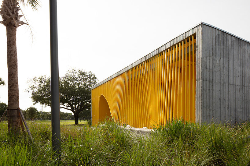 brooks + scarpa sculpts florida pavilion with yellow archways and lattice screen