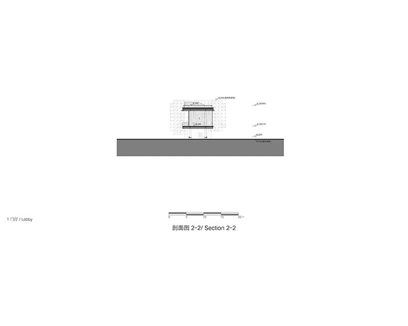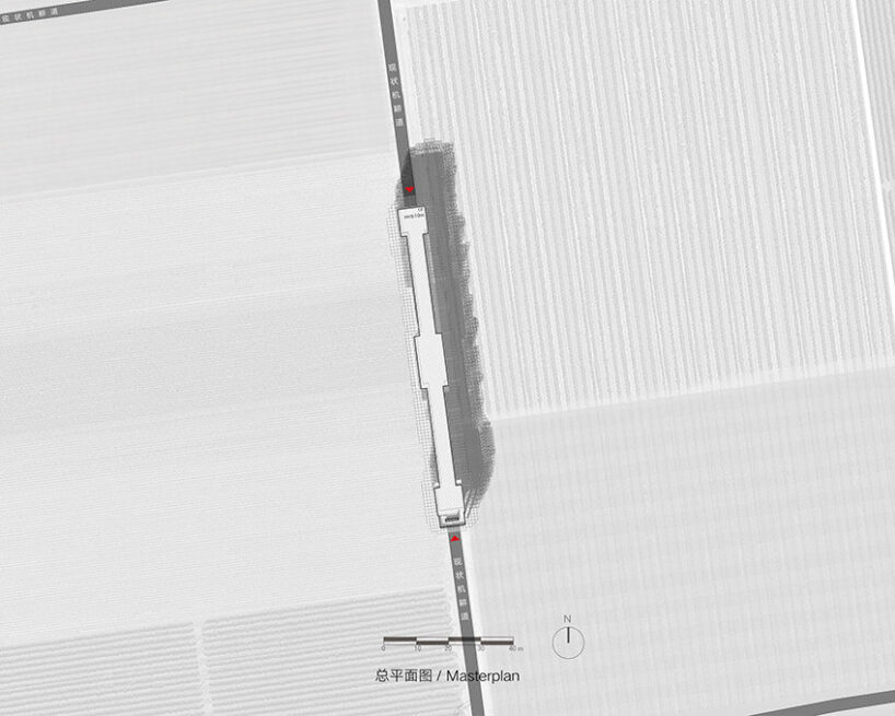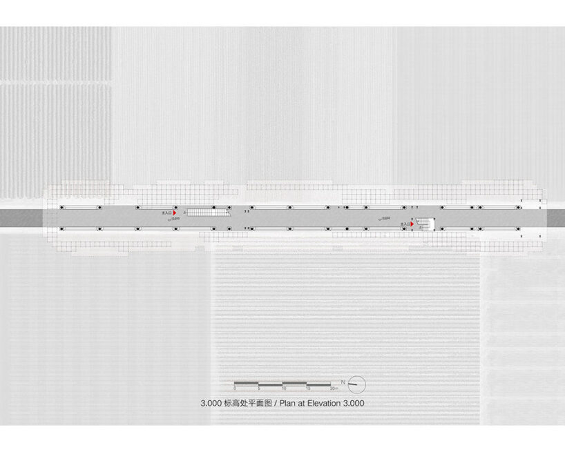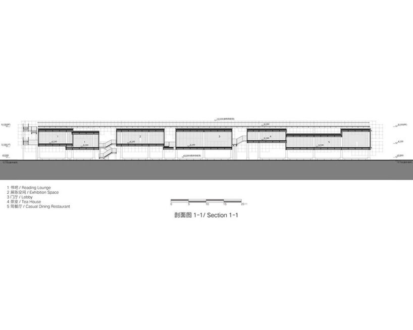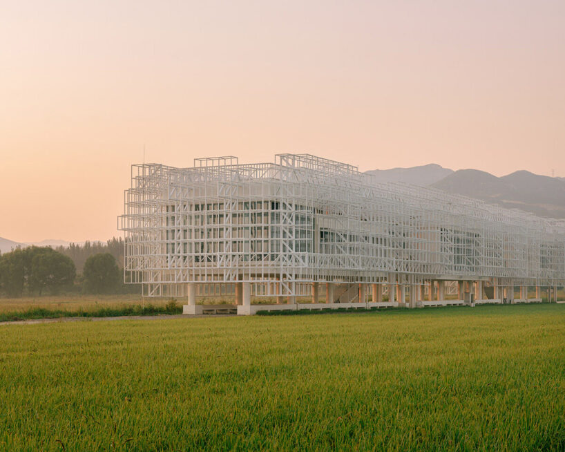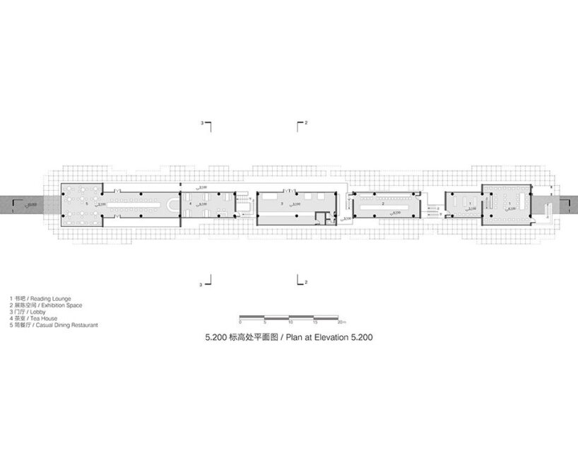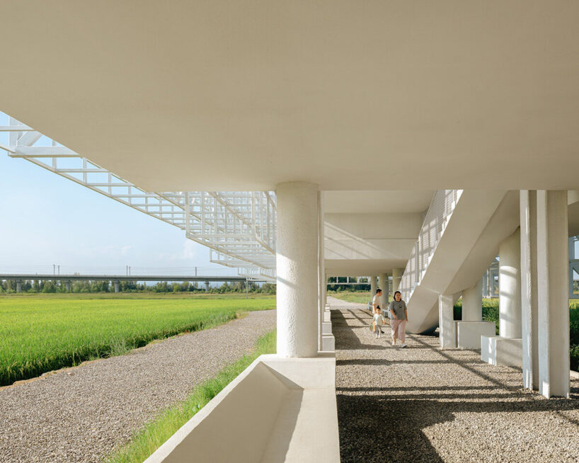 the project sits like a ring placed over the terrain, with its funnel-like roof forming a shaded perimeter walkway and an introverted core.