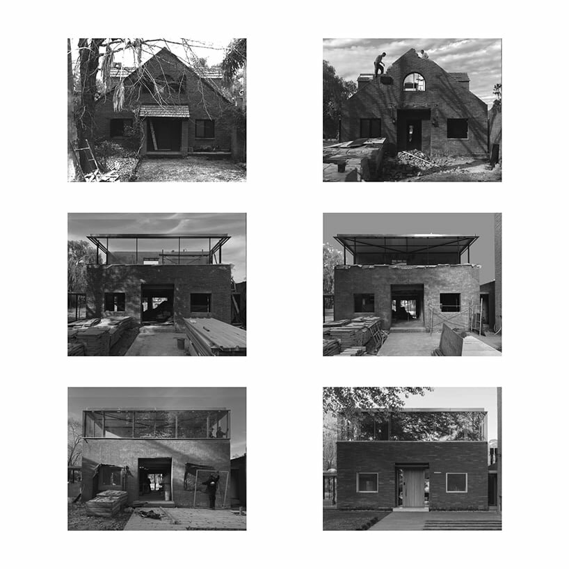 stone covering mirrors exposed brick, while a glazed box rises above the main volume