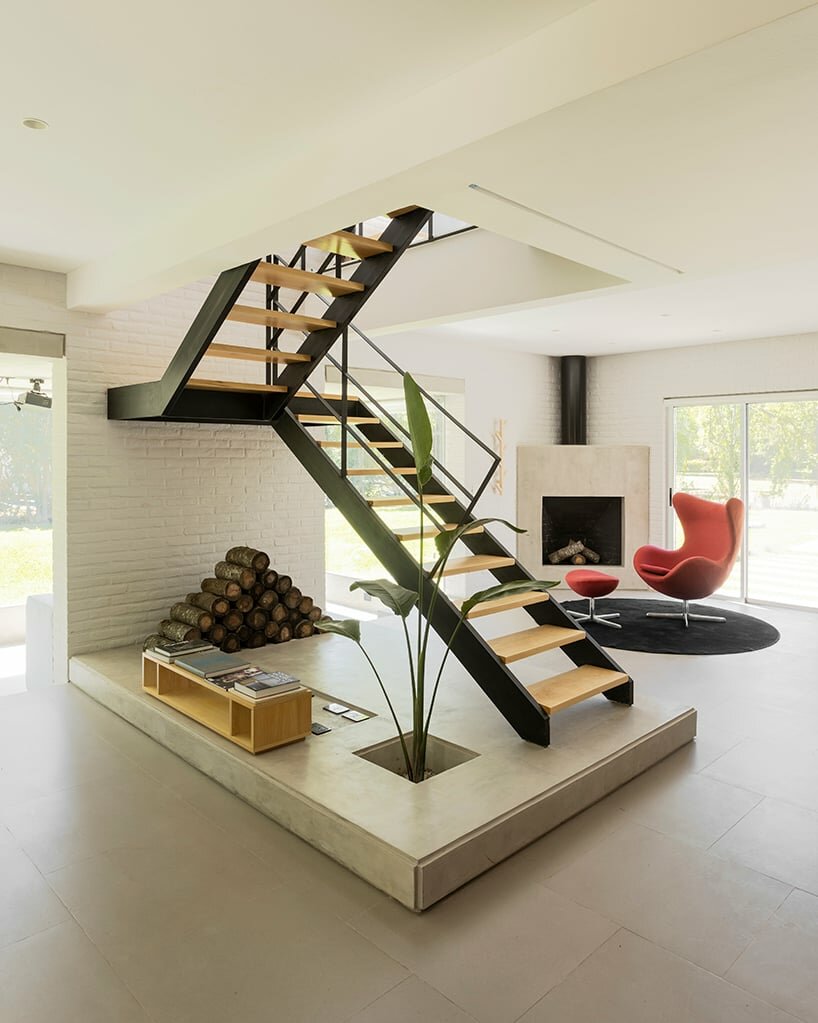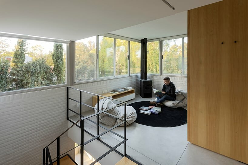 interior organization prioritizes open and flexible layouts, with a central concrete core on the lower floor
