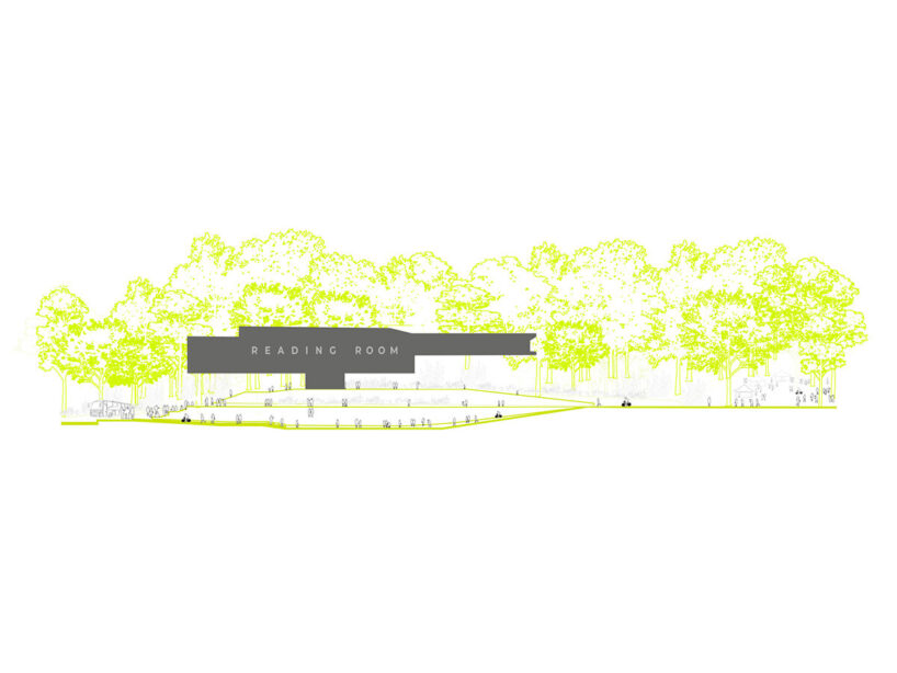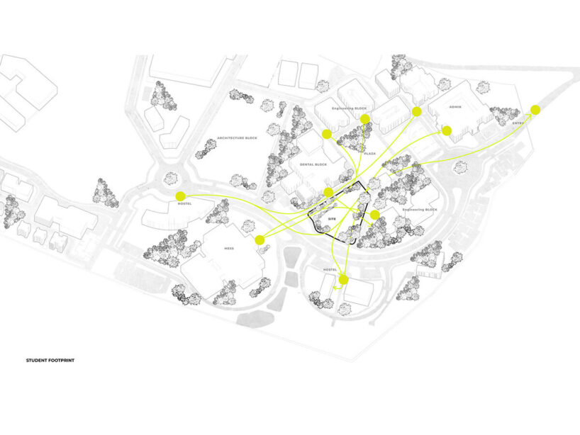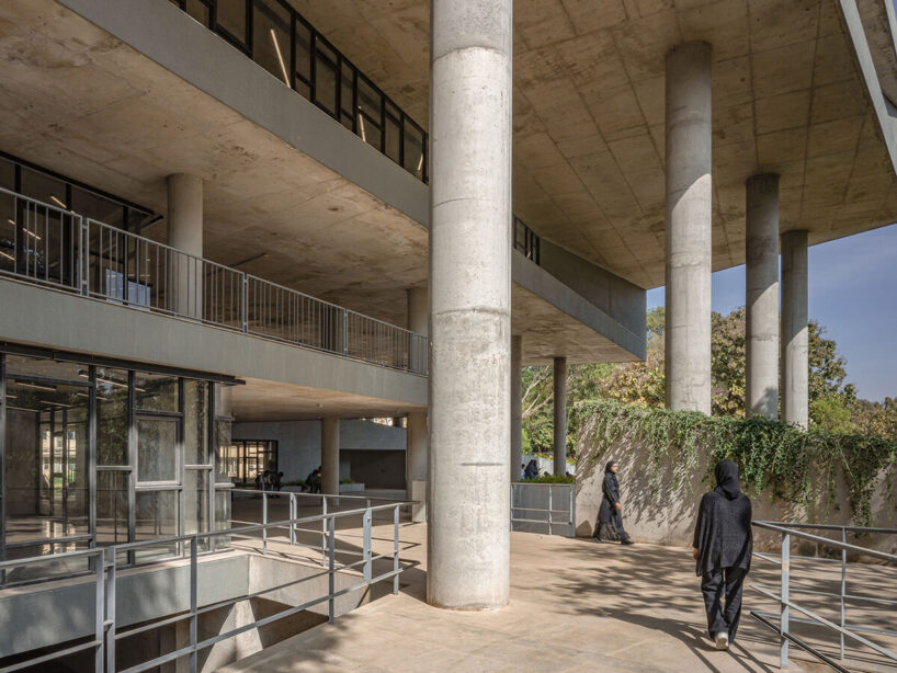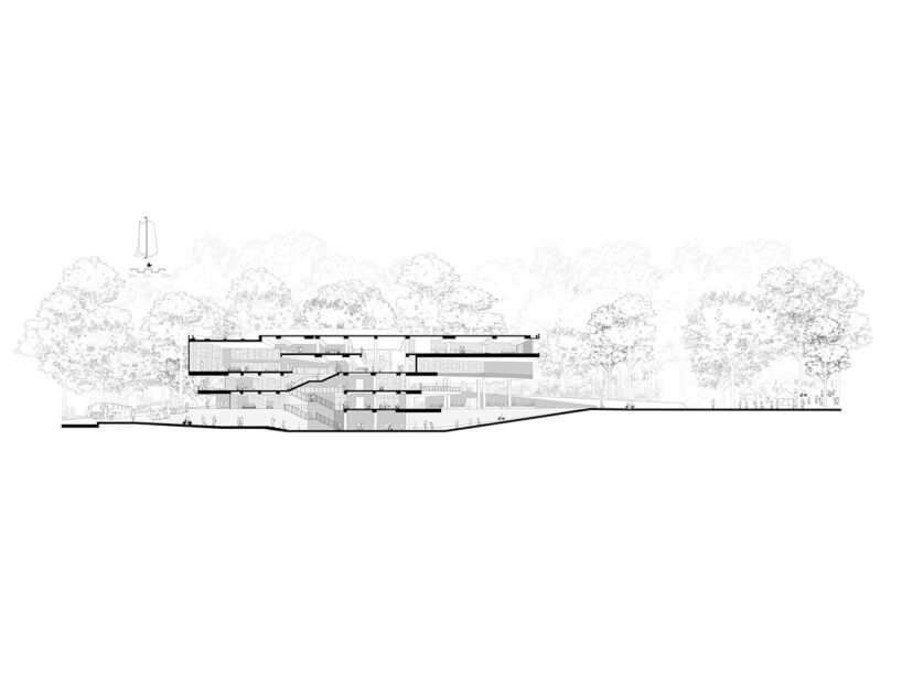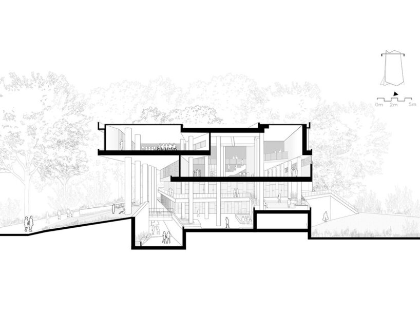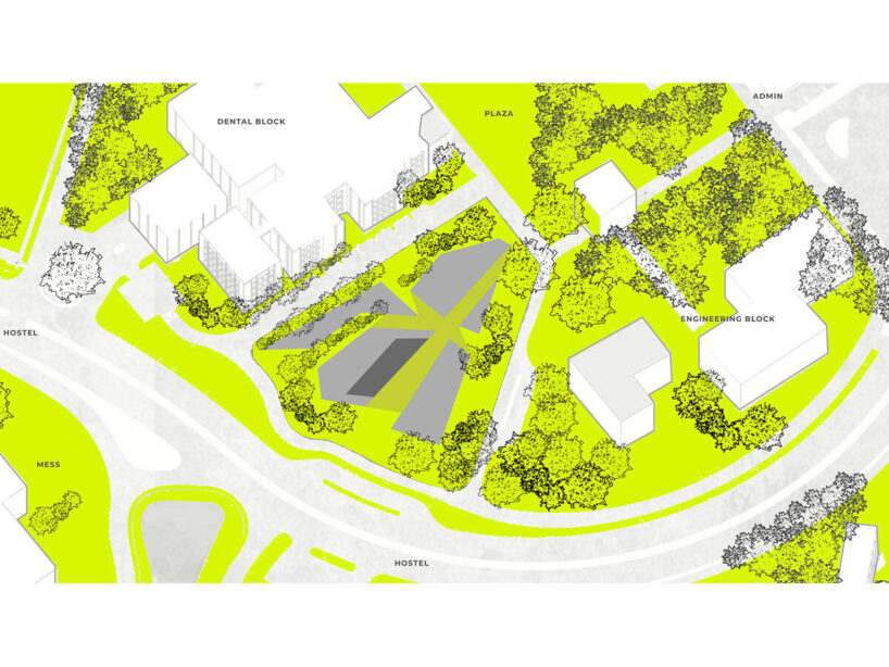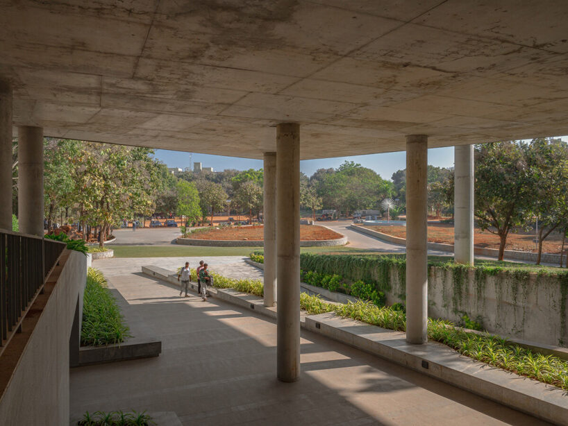 the project sits like a ring placed over the terrain, with its funnel-like roof forming a shaded perimeter walkway and an introverted core.