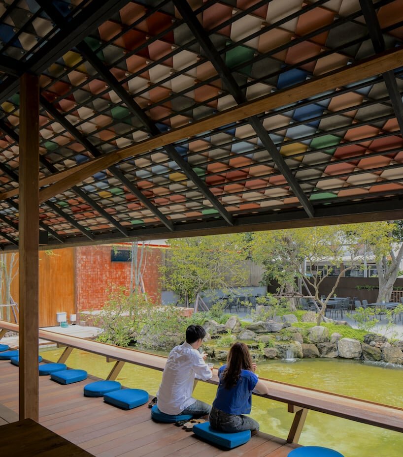 terrace area roof painted in a Thai weave pattern that harmonizes with the hues of the open-air garden