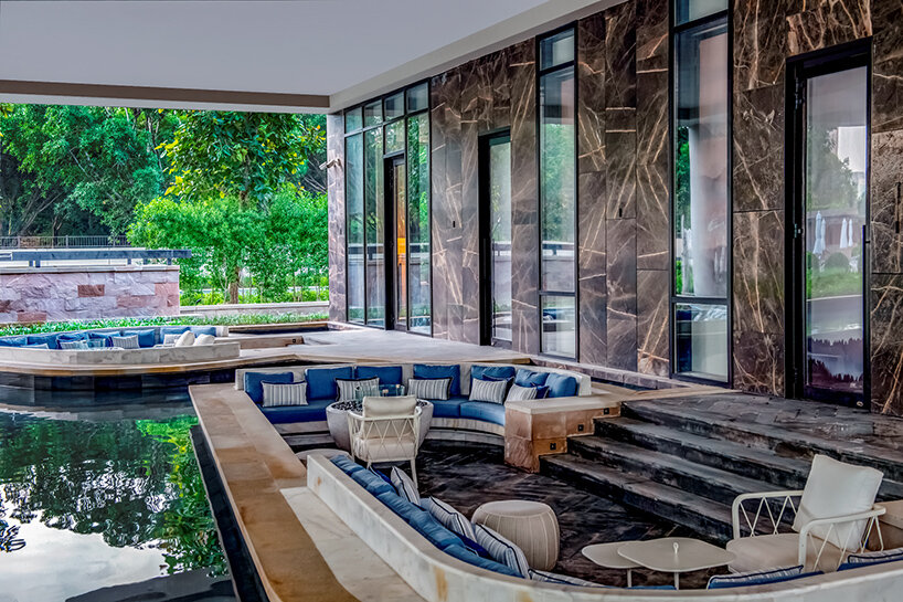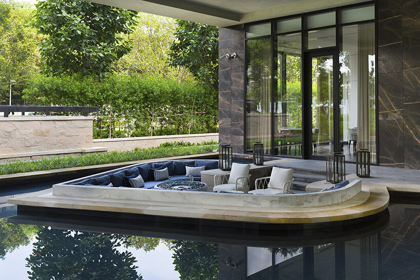 the reflecting pool provides a calm threshold between the residential towers and the wellness club