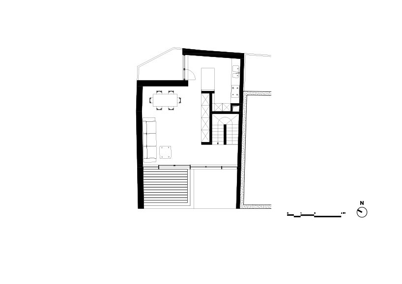 the project sits like a ring placed over the terrain, with its funnel-like roof forming a shaded perimeter walkway and an introverted core.
