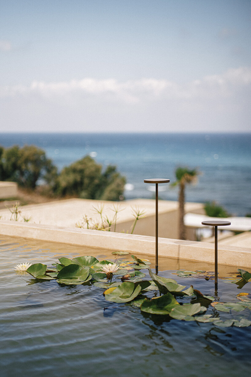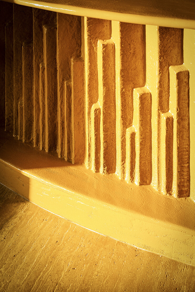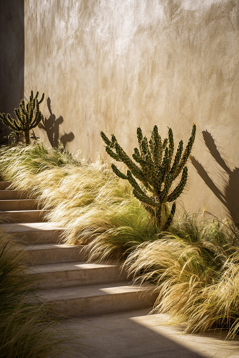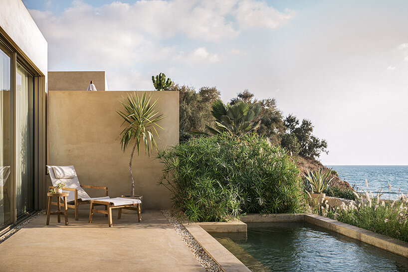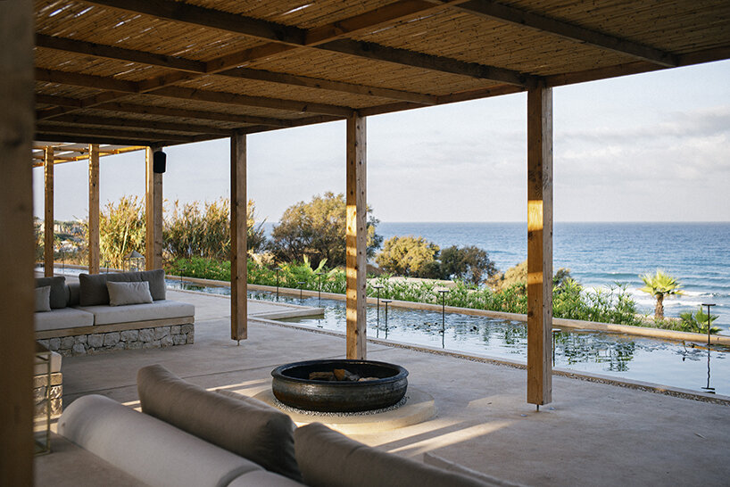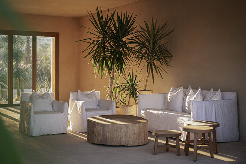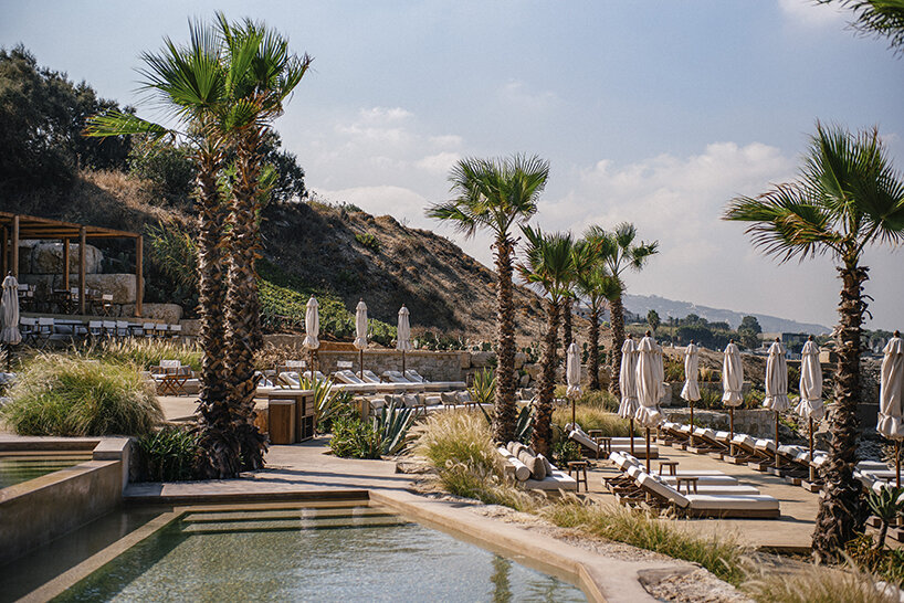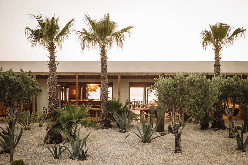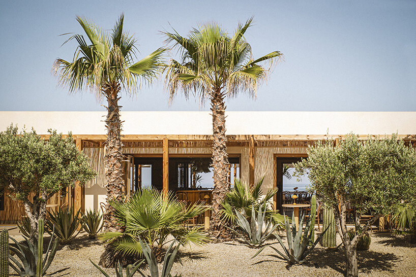 the project sits like a ring placed over the terrain, with its funnel-like roof forming a shaded perimeter walkway and an introverted core.