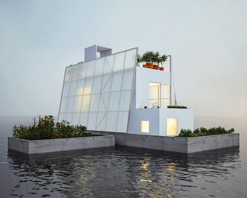 the dwelling is formed of a series of components that can be transported to site by lorry or barge, then lifted into position. the house itself, an insulated rubber coated timber box, sits on floating tray measuring 20 by 7 meters. two side panels then create an outer skin for the structure, as well as a winter garden at the rear of the design. these blinkers will also support photovoltaic panels capable of generating both electricity and hot water.