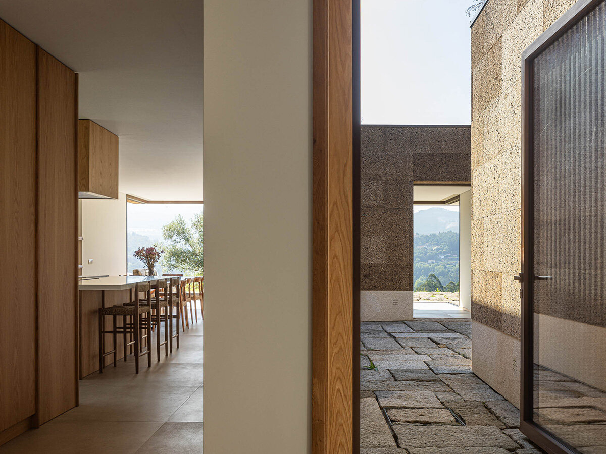 a paved walkway cuts through the ground and leads toward the home’s entrance