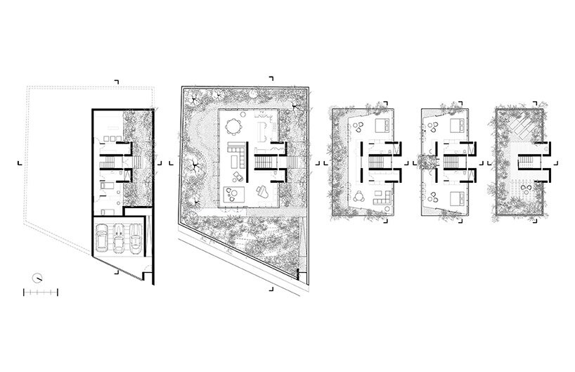 Mexican architecture studio Vertebral presents this Casa Erasto as a ‘house built for a garden’ along a quiet street beside Mexico City’s Chapultepec Forest. The dwelling is hidden behind a wall built of volcanic rock, and is surrounded on all sides by lush plant life — including a flowering Jacaranda bathed in sunlight, and a row of bamboo which demarcates the boundaries of the plot. Casa Erasto rises amongst this micro-forest, itself integrating greenery along each of its three levels and rooftop.