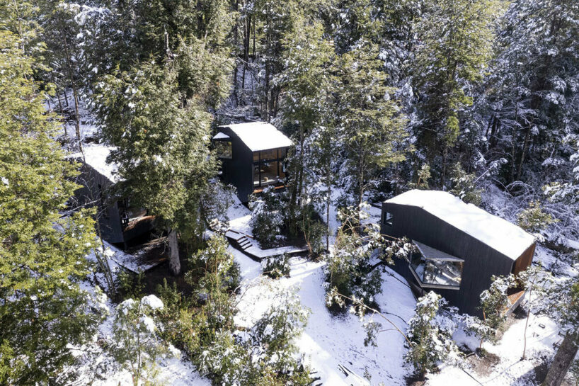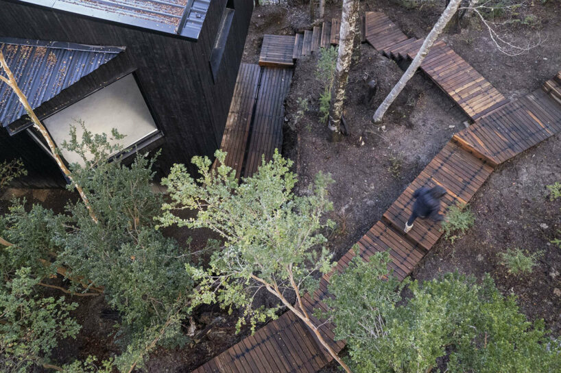 the project sits like a ring placed over the terrain, with its funnel-like roof forming a shaded perimeter walkway and an introverted core.