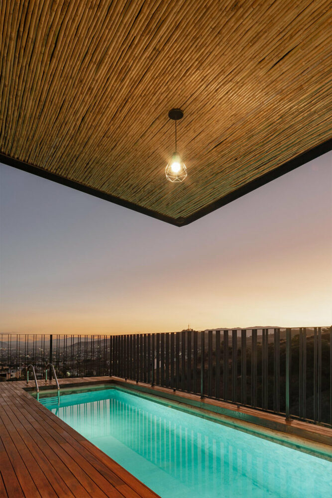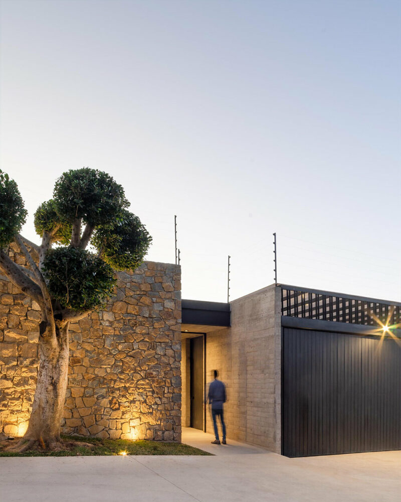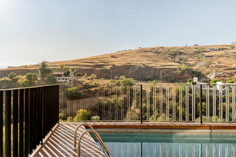 the project sits like a ring placed over the terrain, with its funnel-like roof forming a shaded perimeter walkway and an introverted core.
