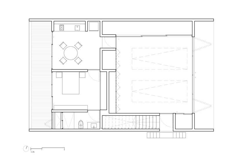 The volume lays out a small living rectangular plan at one end, including a kitchen, a bedroom, and services, providing each room with direct access to the exterior and open terrace. The remaining part of the house assembles a square-like space dedicated to storage, such as appliances, machinery, and vehicles. The interior arrangement sets out an open central zone enfolded within a perimeter of closets and storage spaces of various sizes, as well as an external staircase connecting all functions with the roof that serves as a view platform or lookout.