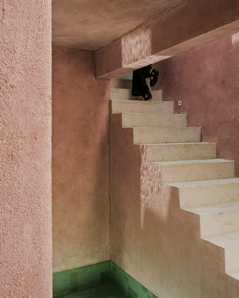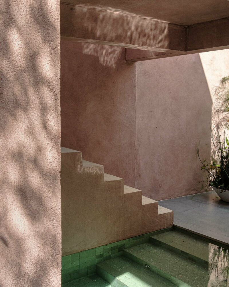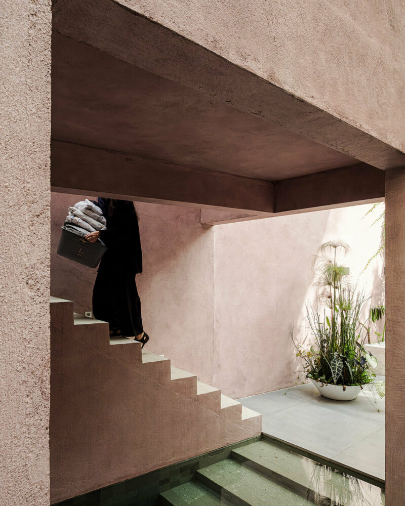 the addition is finished with pink-toned mineral paint and natural green stone