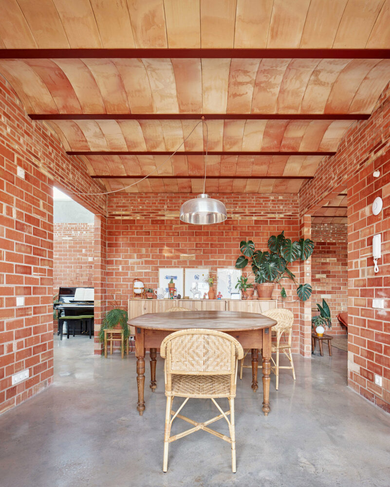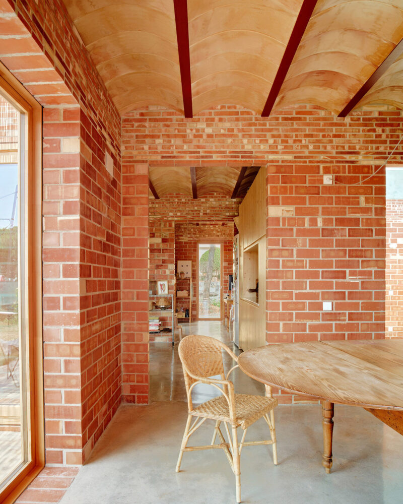 the structure comprises brick load-bearing walls, concrete flooring, and vaulted ceilings