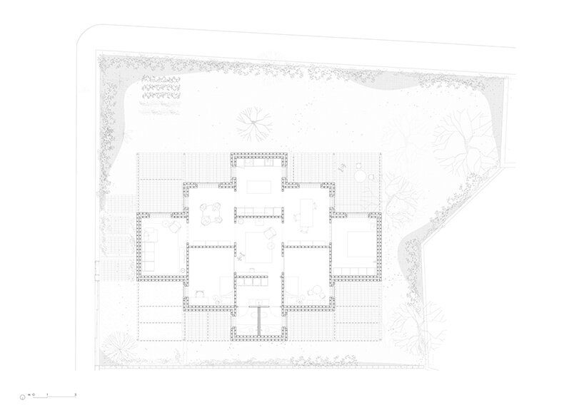 the project sits like a ring placed over the terrain, with its funnel-like roof forming a shaded perimeter walkway and an introverted core.