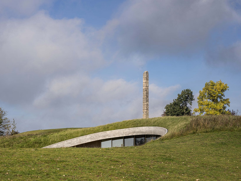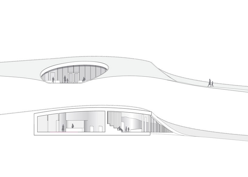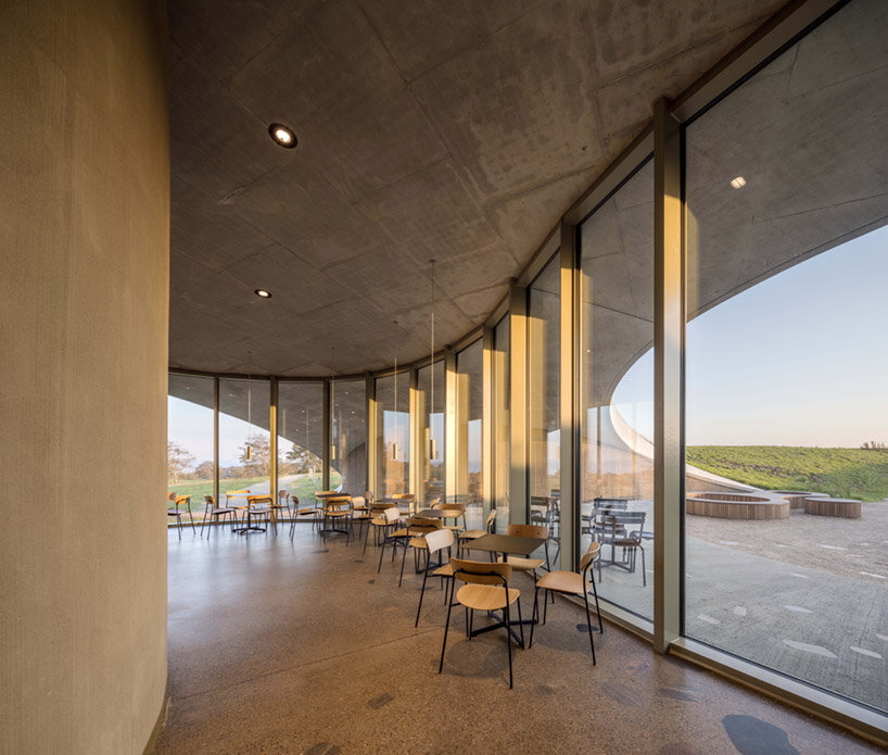 the project sits like a ring placed over the terrain, with its funnel-like roof forming a shaded perimeter walkway and an introverted core.