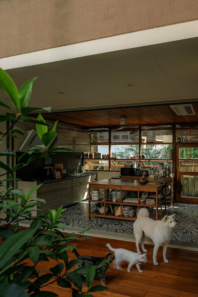The design team removes the solid walls on the first floor, replacing them with a one-meter wooden walkway encircling the inner courtyard. This not only enhances accessibility but also delineates distinct zones for work, pantry, and living areas, each opening to the courtyard. The open kitchen takes center stage, reflecting the owners’ passion for cooking and coffee. A new staircase near the back entrance leads to the second floor, housing private family areas and the master bedroom. The master bedroom enjoys a central position with views of the courtyard, while the guest living room becomes a playground for the five feline companions. The old staircase leads to a spacious semi-outdoor terrace, transforming the former bedroom into a versatile living area overlooking the front garden.