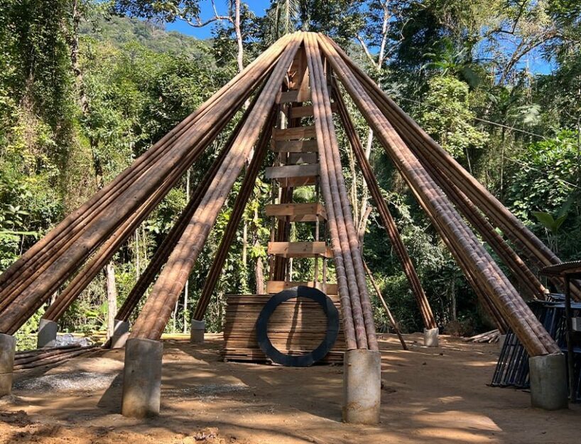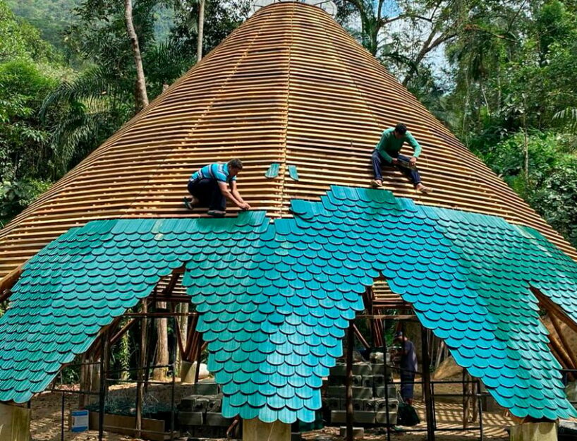 the project sits like a ring placed over the terrain, with its funnel-like roof forming a shaded perimeter walkway and an introverted core.