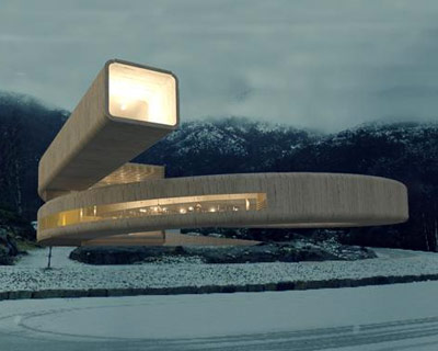 the project sits like a ring placed over the terrain, with its funnel-like roof forming a shaded perimeter walkway and an introverted core.