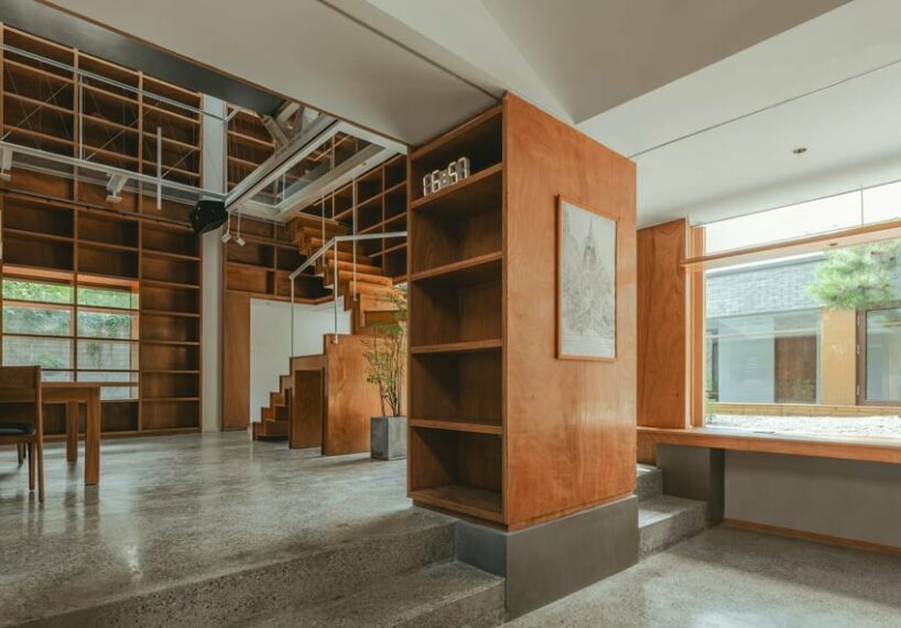 The site is marked by diverse and intricate spatial forms where existing sloped-roof buildings, a vast library, and new intimate flat-roof structures coexist. These different structures interconnect, descending from south to north along the original elevation axis. By adjusting the size of the original buildings Chaoffice created a coherent sense of scale, while opening up the junctions between spaces to allow light, air, sightlines, and the flow of people’s activities to move unimpeded throughout the entire building. Accompanying this flow are visible bookshelves, tables, and the vegetation outside.