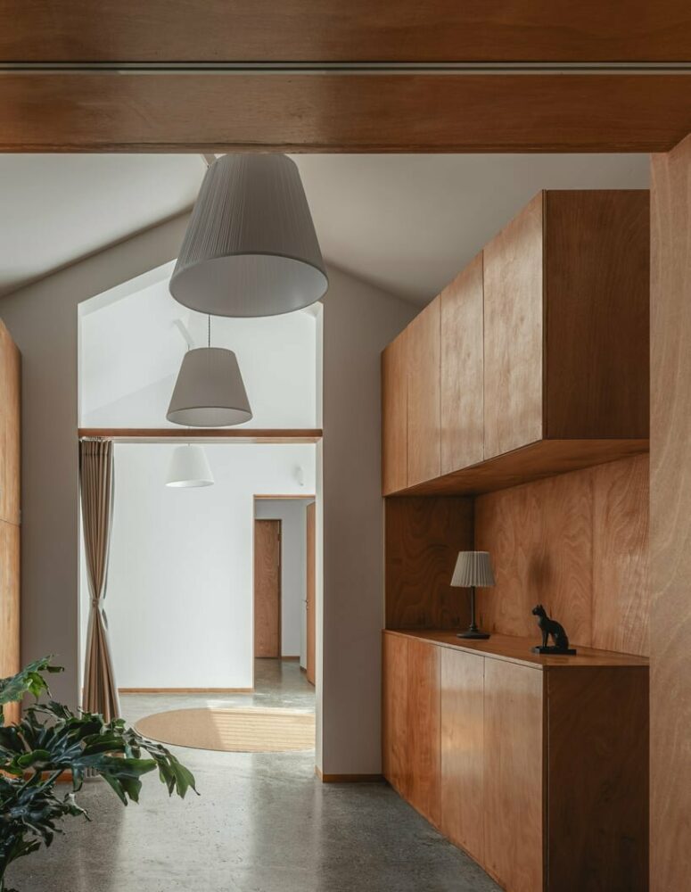 Within House Under the Boat, the architects at Chaoffice sought to maintain consistency in scale between the large library cavity at the center of home and the smaller spaces by inverting the roof, creating a double-height space akin to a ship’s hull. Here, the walls occupied by bookshelves reach a height of up to 6 meters, while the ceiling descends towards the middle of the room. A steel structure suspends this roof, with joints of the framework incorporating skylights for daylight penetration in the vast space.