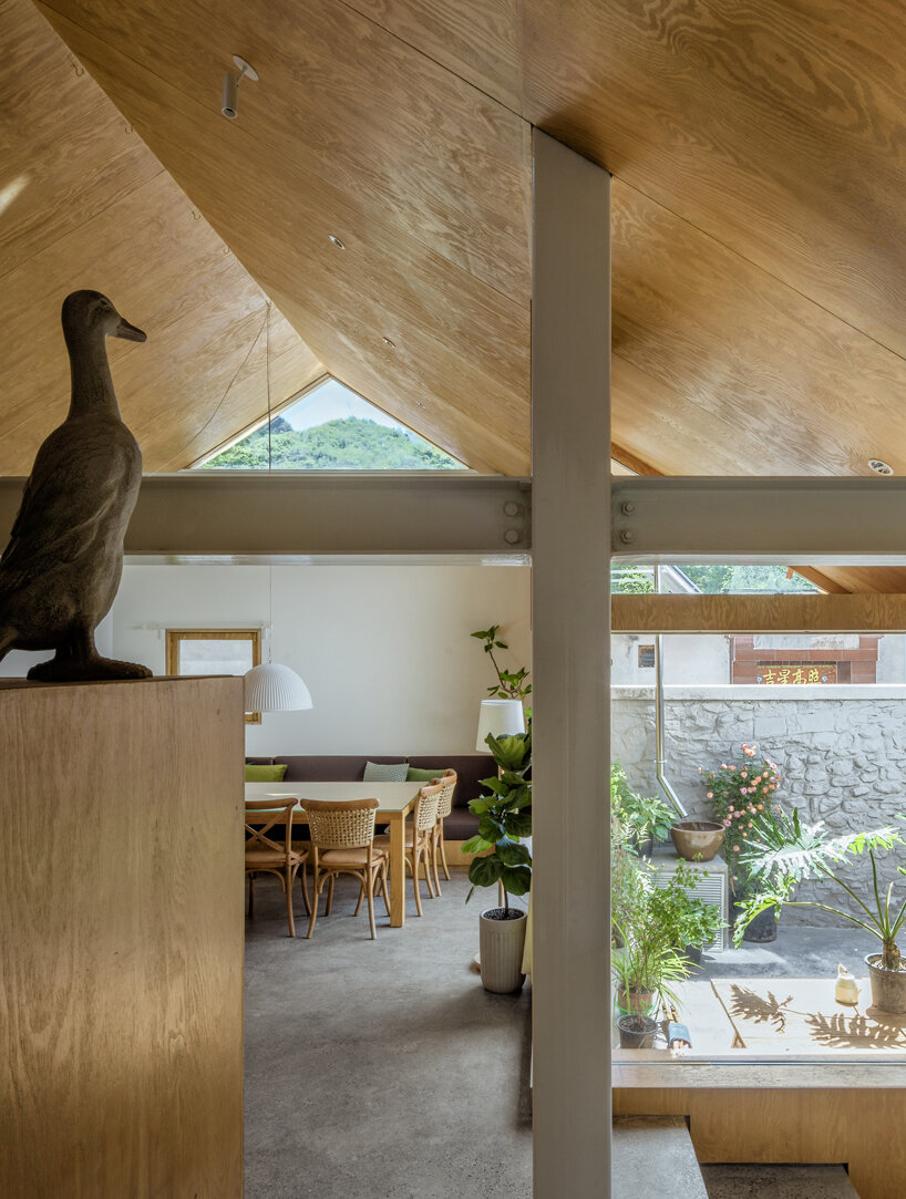The steel pillar and beams beneath the slope are exposed in the living area, and they become part of the feeling it provides. The polished concrete floor is free of joints, making that ‘public’ space feel more integrated and coherent. The courtyard wall retains the same stone masonry as was in place before the renovation, to echo the context of the surrounding village,’ writes Chaoffice.